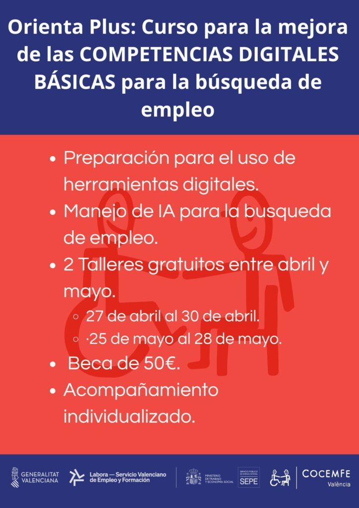 Orienta Plus és un programa impulsat pel servei LABORA de la Generalitat Valenciana amb l’objectiu de millorar l’empleabilitat i promocionar la inserció laboral que COCEMFE València dirigeix al colectiu de persones amb discapacitat.